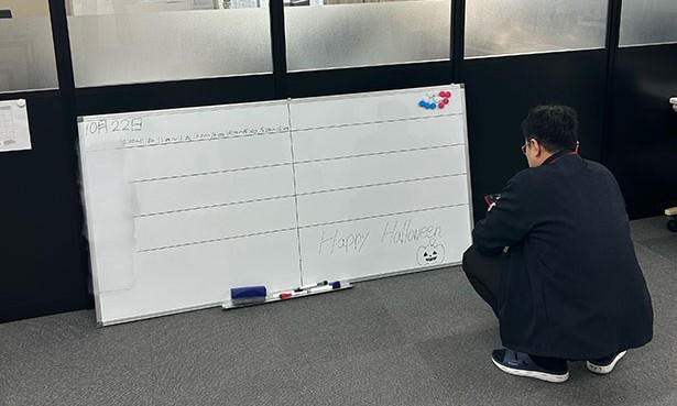 ホワイトボード前に座っている管理者さんは「どんな風に完成するかな」と、楽しみにしているようです😊
